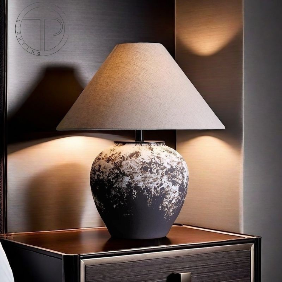 Đèn bàn ngủ phong cách sang trọng, thân gốm nghệ thuật kết hợp chao vải cao cấp, ánh sáng vàng ấm áp, tạo cảm giác thư giãn hoàn hảo.