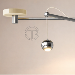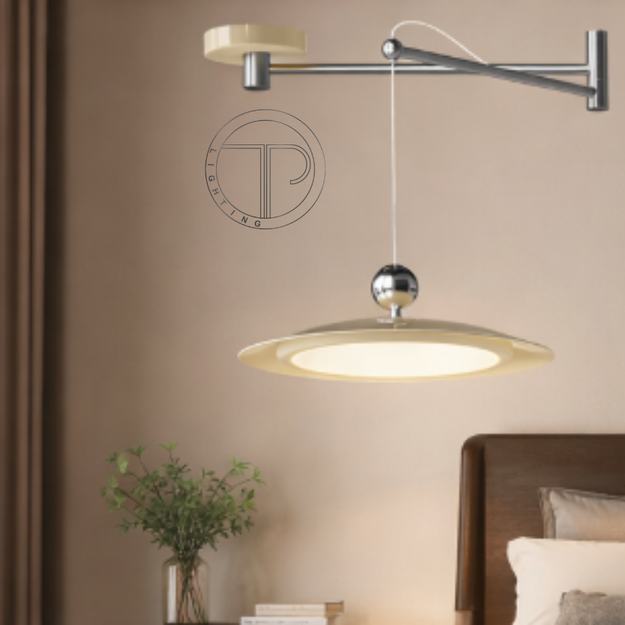 - Chụp đèn dạng đĩa phẳng, chất liệu hợp kim phủ sơn màu kem sang trọng, kết hợp chi tiết cầu kim loại mạ chrome sáng bóng tạo điểm nhấn tinh tế.